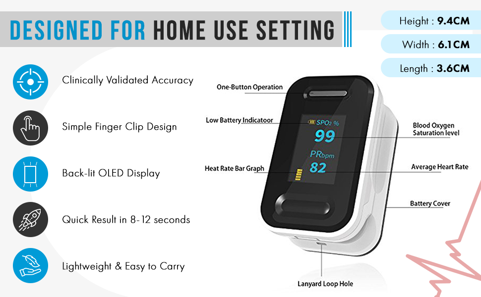 - PACKAGE INCLUDES: 1x oximeter, 2x AAA batteries, 1x neck cord, 1x pouch, 1x user manual