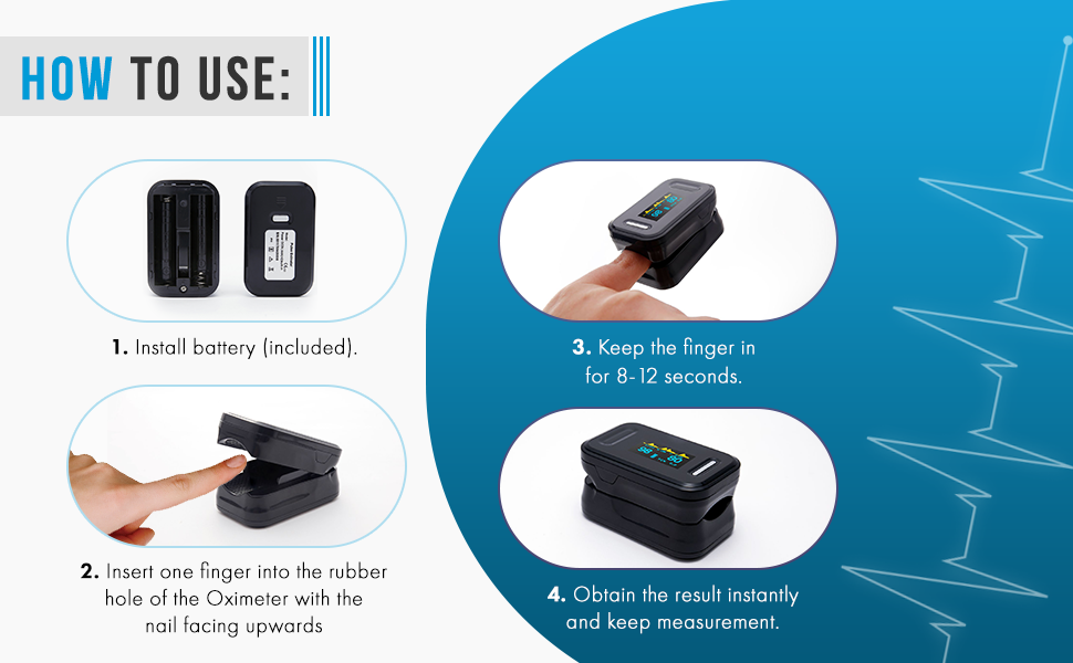 - INSTRUCTION: The device has a function where it turns off after 8 seconds of inactivity. If the user does not place it correctly on the finger, it will turn off. In such cases, they must readjust the placement on the finger. Furthermore, the user must stay motionless when the oxygen level monitor measures pulse and SpO2