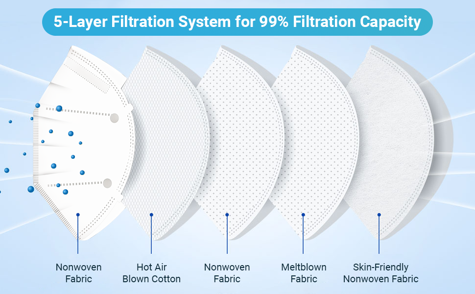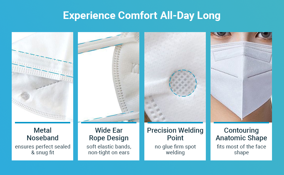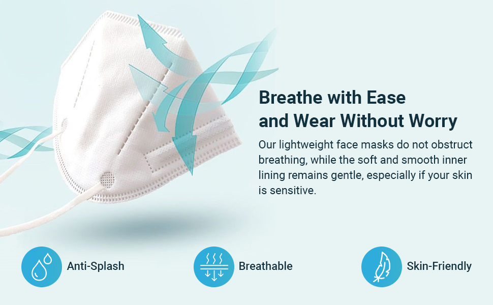 - FEATURES: These masks consist of 6 layers, elastic ear loops, are soft, comfortable, provide a perfect fit, hypoallergenic, have an adaptable nose bar, high filtration rate, low breathing resistance, and are skin-friendly